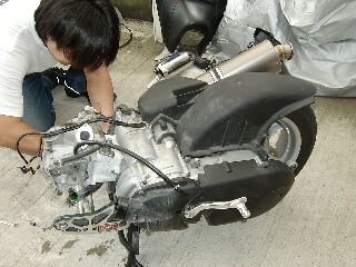 T氏「カウル、シート、燃料タンク等を外します」