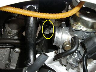 キャブを少し後方に引き抜いてからアクセルワイヤーを止めているナット(丸印)を外すと作業しやすいと思います。