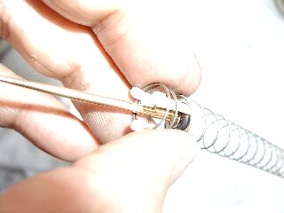 フロート室にガソリンが流れ込んで溜まってくると、この浮き輪が上下して、それ以上ガソリンが入ってこないように調整してます。