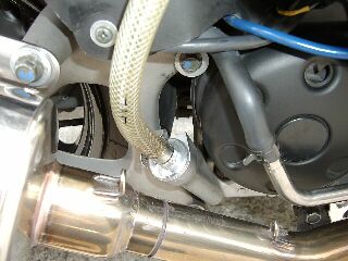 ウォーターポンプ側を見たところです。エアクリーナーBOXに付いているホースを辿ると、ここに当たります。これを長目の耐油ホースに交換してキャッチタンクへ繋ぎ替えます。